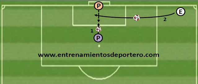 1.) El portero desde posición central de salida, se desplaza para dar apoyo al compañero y le hace una devolución al primer toque